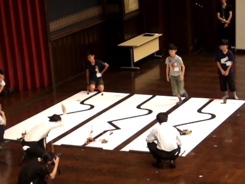 | テクニカルコース部門は、光センサーで白黒に塗り分けられたコースを辿りながら走ります。今回のテーマは、人を途中で乗せてゴールし、ゴール後30ポチ以上の旗を上げることでした。 |