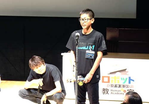 中村君は、水陸両用ロボットを作成し、創作部門に挑戦しました。中村君は9月にロボティクスプロフェッサーコースに入ったばかりで、まだプログラミングのレッスンをほとんど受けていません。それでも挑戦した彼の闘志に古田先生から「今後に期待する」と言わしめました。ロボットも面白く発表も抜群でした。