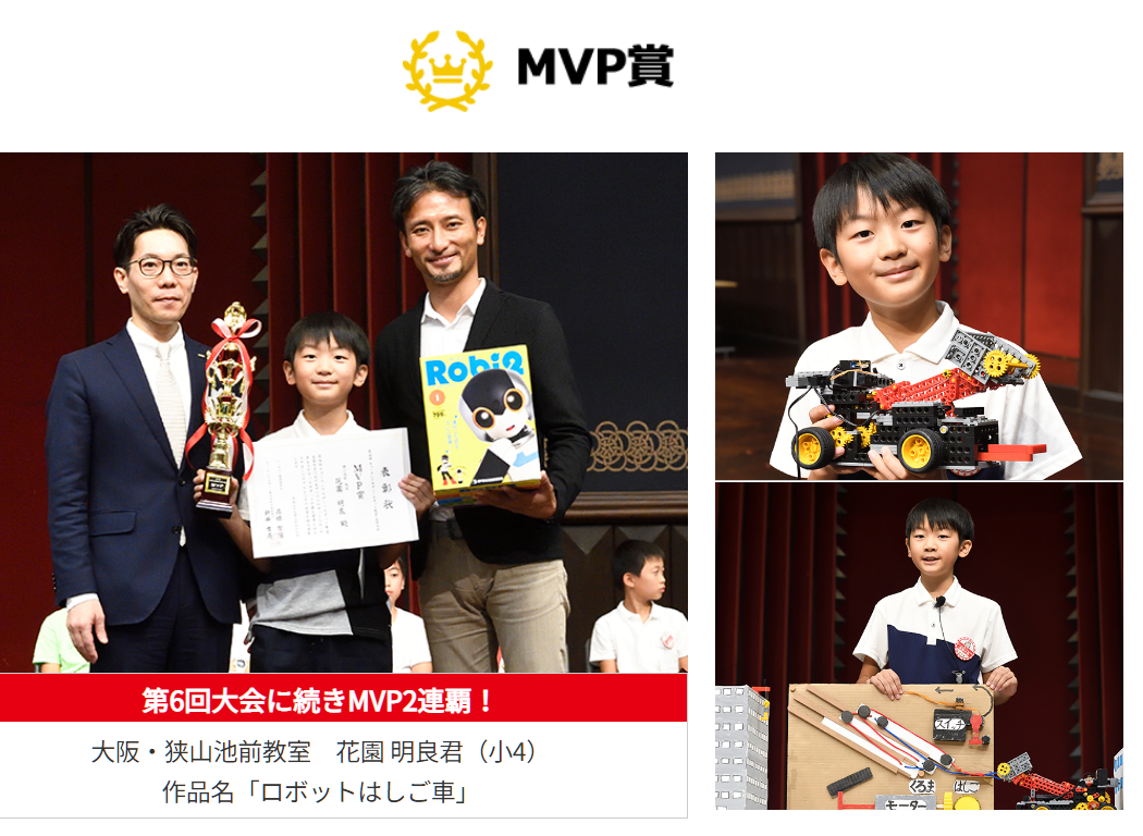 出張叶真実君(狭山池前教室)は、電車と転車台を作成しアドバンスコースのアイデア部門で出場し、全参加者の中で最も優れた発表に贈られる『MVP』を見事受賞されました!