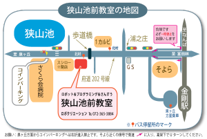 ※金剛駅からバスをご利用いただけますと、泉が丘方面行きバスの第1停留所が「北村」で降りていただけますと目の前がロボクリエーション(狭山池前ロボット教室)です。